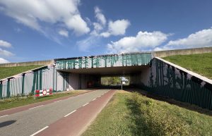 De binnenzijde van het viaduct vormt een visuele verbinding tussen beide werelden. Met een kleurverloop worden de industriële geschiedenis en de natuurlijke omgeving op een subtiele manier met elkaar verbonden.